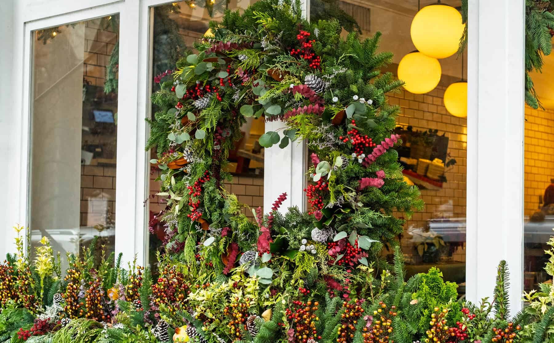 Once all the trees have dropped their leaves, a splash of color at the front of your home is more needed than ever. Red and orange berries, pinecones, and brightly colored dogwood twigs all nestle into a deep green spray of fragrant pine, silver fir, and boxwood boughs.