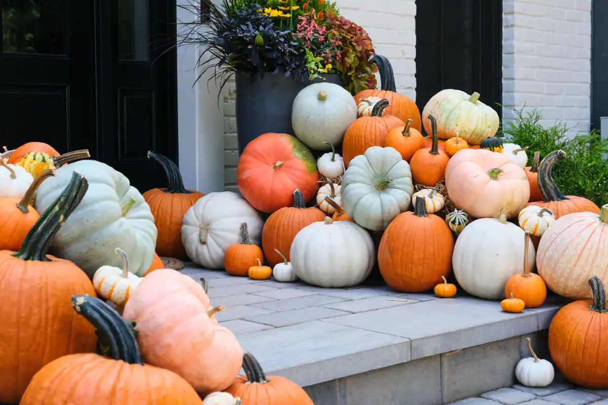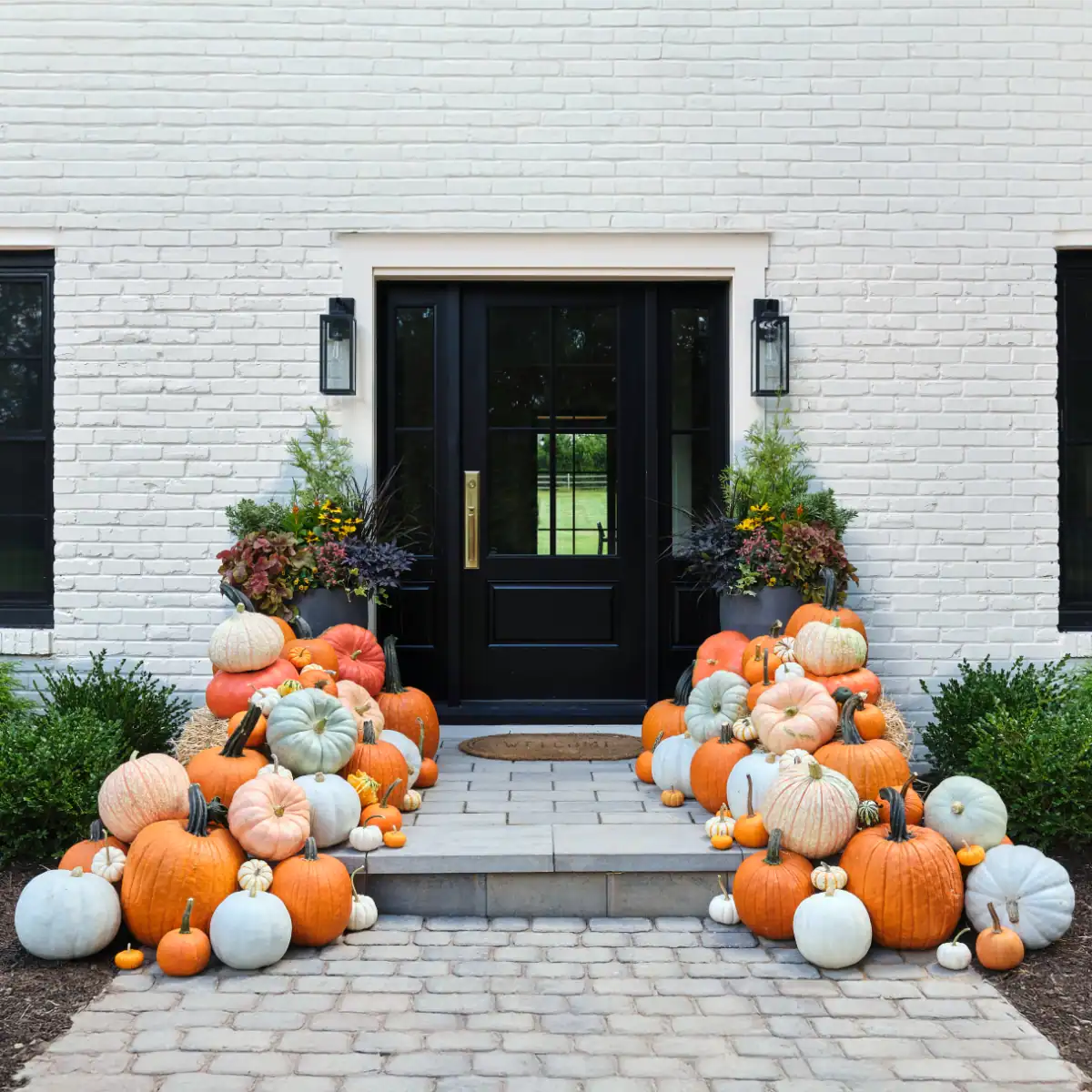 The Deluxe Collection is our most popular package — and it’s easy to see why. Stacks of specialty pumpkins in rich fall colors, paired with jack-o-lanterns, ghost pumpkins, pie pumpkins, and mini gourds, create a lush and abundant look. With two bales of hay and professional design included, your porch will be instantly transformed into a festive fall showcase.